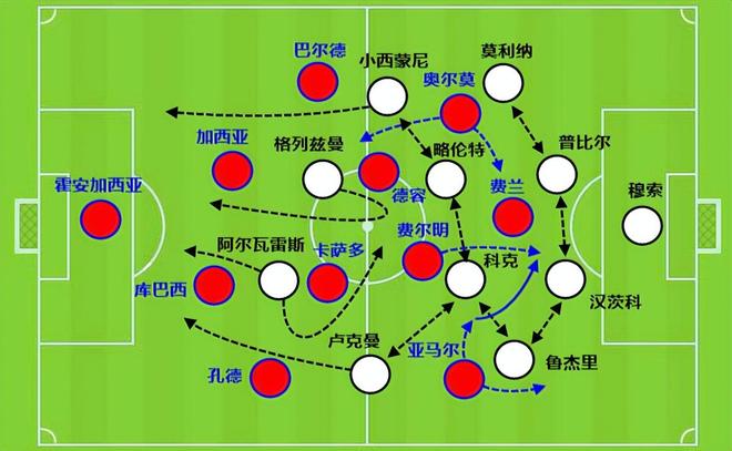 奥尔莫作为前腰、佩德里在中场,卡萨多或者博纳尔作为后腰,最大程度保证中场站位的合理性,到下半场上费尔明增加冲击力和远射。