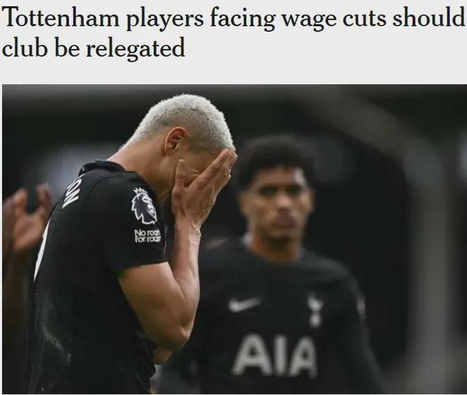 TA记者DO发文表示,假如降级,那么热刺球员将面临大幅降薪。